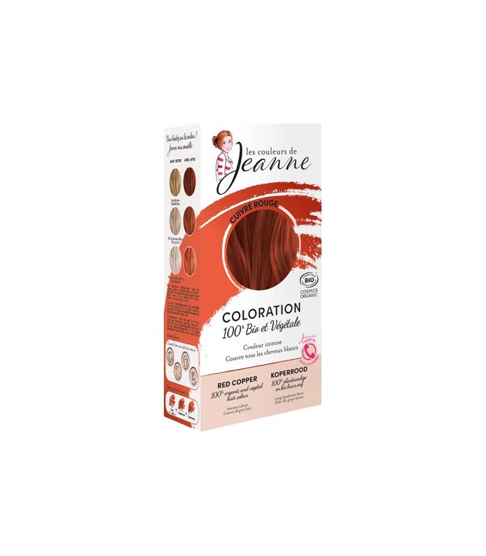 Coloration végétale Jeanne cuivré rouge, à base de henné et de plantes tinctoriales, pour des reflets chauds et intenses naturellement lumineux.