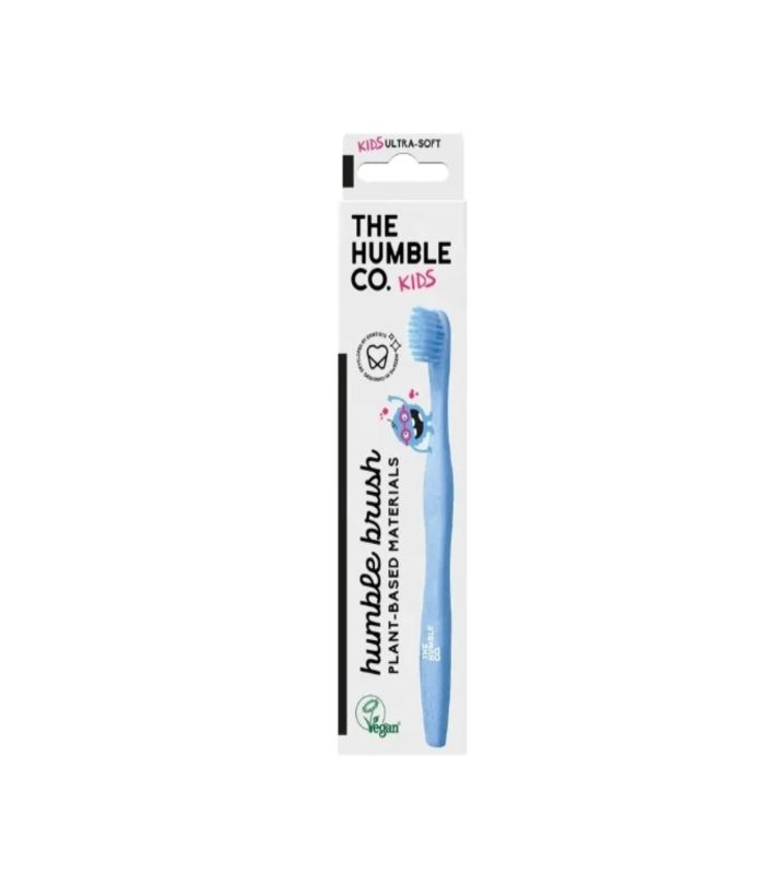 La brosse à dents Humble bleue pour enfants est fabriquée à partir de matières végétales durables et conçue pour respecter à la fois les dents sensibles des enfants et l’environnement.