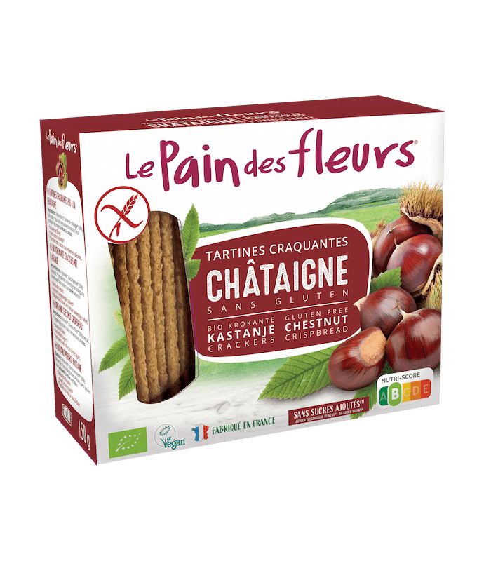 Ingrédients issus de l’agriculture biologique, sans pesticides ni engrais chimiques de synthèse. Châtaigne naturellement source de glucides complexes, apportant une énergie progressive. Recette sans gluten, adaptée aux personnes intolérantes ou sensibles. Texture fine et croustillante favorisant une digestion légère. Alternative naturelle au pain traditionnel, sans levure ni additifs.