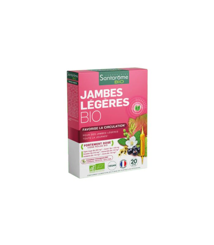 Santarome Jambes Légères Bio est une formule naturelle concentrée en extraits de vigne rouge, de marronnier d’Inde, d’hamamélis et de mélilot, reconnus pour leurs vertus sur la circulation veineuse. Enrichi en bourgeons de châtaignier, sorbier et noisetier, ce complexe aide à retrouver confort et légèreté dans les jambes, surtout en période de chaleur ou de station debout prolongée.