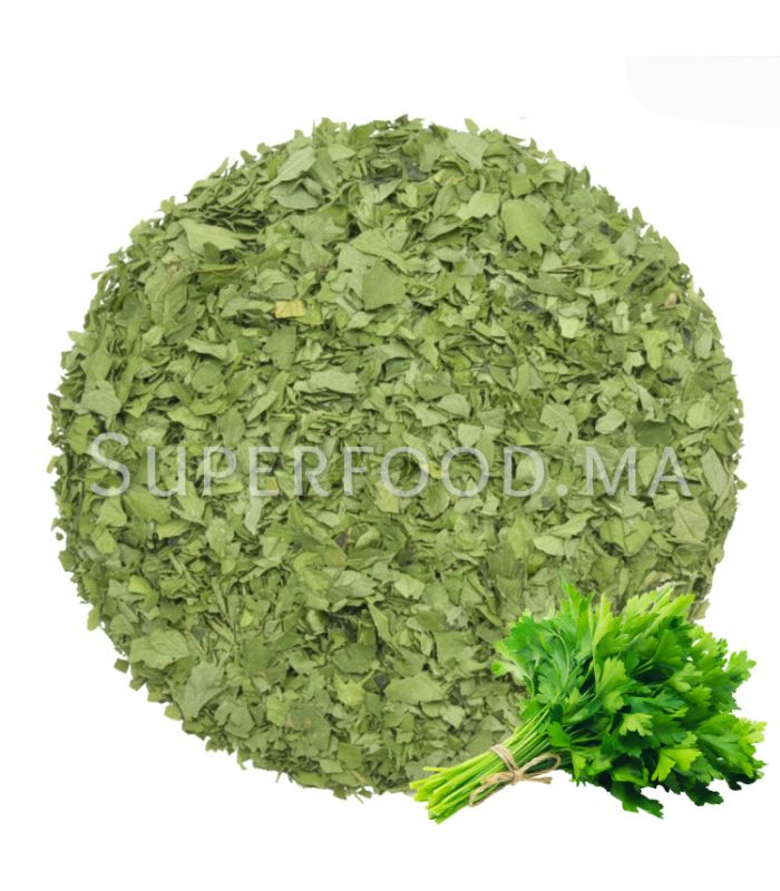 Le persil séché est une plante traditionnellement utilisée pour ses propriétés digestives, drainantes et reminéralisantes. Riche en vitamine C, fer, potassium et antioxydants, il aide à soutenir l’organisme, à faciliter l’élimination de l’excès d’eau et à améliorer le confort digestif.