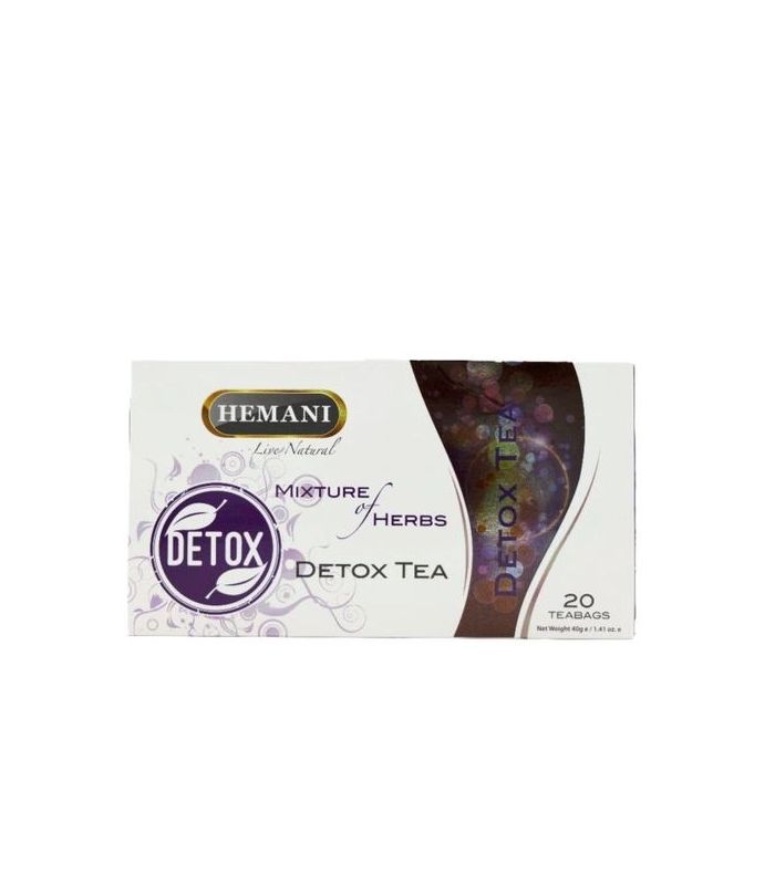 La tisane Hemani détox: Contient différents types de plantes qui ont des effets purifiants et détoxifiants tout en améliorant la digestion et en prévenant les infections des voies urinaires et des calculs rénaux. Chicorée, gingembre, citronnelle, citron, thé vert.